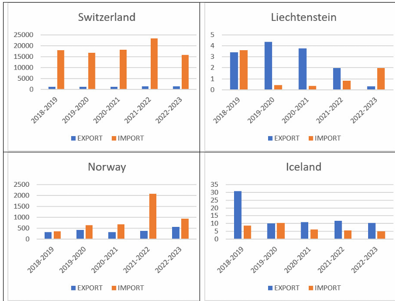 India’s engagement with EFTA has culminated in a major milestone: the Trade and Economic Partnership Agreement (TEPA) between India and the four EFTA countries was signed on 10 March 2024 after long negotiations and subsequently entered into force on 1 October 2025. This marks India’s first comprehensive trade pact with four developed European economies outside the EU framework. In the fiscal year 2022-23, EFTA ranked as India’s fifth-largest trading partner, trailing the EU, the United States, the UK, and China, with two-way trade valued at USD 18.65 billion and India recording a trade deficit of USD 14.8 billion; Switzerland stands out as India’s largest partner within the bloc, followed by Norway. Exports to EFTA dominated in machinery and pharmaceuticals, while Indian exports were led by organic chemicals.